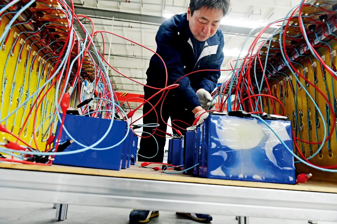 河北邢台市新河县一家电池企业内,工作人员在生产线上加工电池。新河县打造新型电池产业基地,引进废铅酸电池回收、处置项目,延伸电池“生产—回收—再生”的绿色循环产业链。图/新华