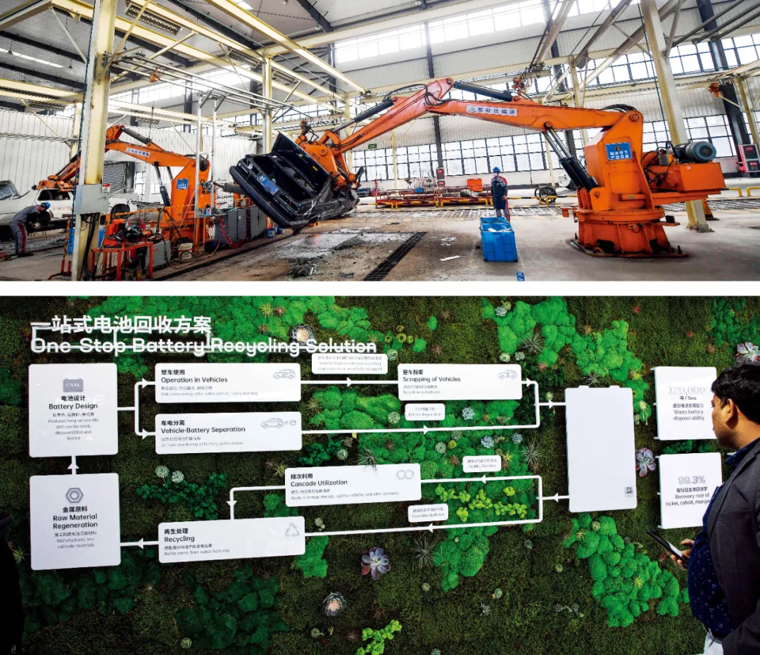 下图:2023年4月,在上海车展期间,宁德时代展示的一站式电池回收方案。图/视觉中国